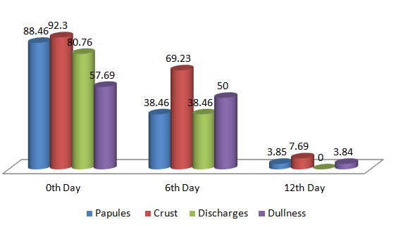 Aziythromycin is a nitrogen containing macrolide which had the both anti-inflammatory and immune-modulatory properties and directly influences phagocyte and lymphocyte function as well as chemotaxis.7 In the present study, observed signs were specific to the cutaneous form of pox and lesions are absent in the respiratory tract which indicates there is only cutaneous form of pox. The present study, birds were treated with azithromycin to control the secondary bacterial infections as well as to increase the immunity.