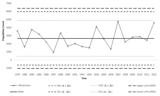 The position of data relative to the empirically-derived limit lines enables differentiation of routine variations from exceptions and informs judgment of whether a system is predictable and stable, or not, using empirically-derived rules. The SBC of population counts for the Nihoa finch revealed that throughout the period from 1979 to 2012 the population remains stable within natural limits (Figure 1), displaying a steady state (i.e. stable system) in line with SBC rules 1-7. However, the eighth SBC rule for conservation requires that where a LNL falls below an acceptable zero (e.g. a population count of zero indicates extinction, so is definitively unacceptable) then the system should be considered as being of concern. In the case of the Nihoa finch, despite a healthy mean population of approximately 2500, both sets of lower limits calculated at x̄ - 3σ and x̄ - 2.66(MR) fall below zero (Figure 1). This indicates that the species may fall to extinction in any future time so continued monitoring is required to avoid any such occurrence.