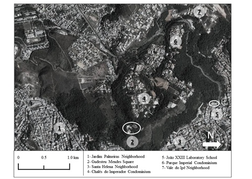 The woodland fragment known as Morro do Imperador Forest is situated between coordinates 21°45’13”-21°46’13”S and 43°21’19”-43°22’15”W. It is an area consisting of a mosaic of fragments totaling 78 ha of secondary forest; Mata do Morro do Imperador reaches an altitude of 923m, one of the highest points in the city. According to Sato,35 this area is classified as Seasonal Semi-deciduous Mountain Forest, a subdivision of the biome Atlantic Forest. It is one of the remaining fragments of this type of woodland in Juiz de Fora, localized in a central area of the city that is comprised of private land as well as public areas belonging to the municipal government. We apply the procedures, which we will describe later, at seven sites in the area surrounding the forest fragment (Figure 1).