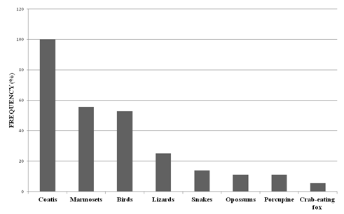With the results of the interviews, we verified that some species of wild animals have frequently approached the urbanized areas of the studied region. Among the species most visualized near these areas, the coatis were reported by all the interviewees. In addition to coatis (100%), other species of mammals were also mentioned, such as: Marmoset (Callithrix sp) (68.83%), opossum (Didelphis aurita) (51.95%), porcupine (Coendou prehensilis) (28.57%); Crab-eating fox (Cerdocyon thous) (8.88%), reptiles such as Tuoinambis lizards (Tupinambis merianae) (14.29%) and several species of snakes (unidentified) (12.99%); besides birds in general (74.55%). In a ranking that we established in relation to the sequence in which these animals were mentioned, we observed: 67.53% of the interviewees cited coatis first, 23.38% were cited as the second animal, and 6.49% placed third and 1.30% in the fourth and fifth position (Figure 2).
