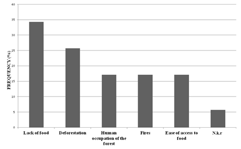 All the interviewees (100%) attributed the coati's approximation to residences in search of food. The reasons for this were mainly related to the lack of food resources available in the forest, followed by the constant processes of deforestation, anthropic occupation, and the burning of the area studied (Figure 3).