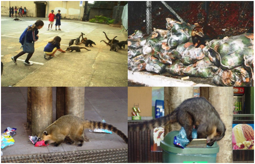 Figure 4 Coatis in the region surrounding the Morro do Imperador forest, Juiz de Fora city, Minas Gerais state, Brazil. Above and left: Coatis interacting with children during recess at a college located near the forest fragment. In the picture, you can see some children offering cookies to the animals. In the image above and to the right: a coati on the bags containing coconut debris. This coming from a kiosk that sells coconut water on the banks of a highway that cuts the forest fragment. In the images below: it is possible to see coatis foraging in the trash.