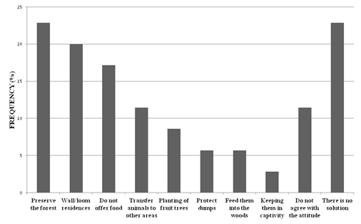 The respondents pointed to the fire as the main problem regarding the reserve preservation (90.90%). Of respondents, 22.08% pointed to a highway that cuts the fragment as a problem, or potential threat to the animals that live in that reserve. Only 7.79% of the respondents said that the disorderly growth of the city, or irregular urban occupation, can also influence the conservation of this fragment and the species living there. The main measures proposed to minimize these problems were the following measures: the carrying out of educational campaigns and the increase in the Morro do Imperador’s forest preservation oversight; to build walls and loom access areas to the forest, making it impossible for the animals to contact the residences; not to feed the animals; transfer the animals to other preservation areas; among others. However, it was also pointed out by the interviewees that the problem would no longer be solved, while others proved to be extremely resistant to any measures that might prevent coati visitations to residences (Figure 6).