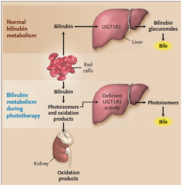 Bilirubin is normally cleared from the body by hepatic conjugation with glucuronic acid and elimination in bile in the form of bilirubin glucuronides. Neonatal jaundice stems from a transient deficiency of conjugation (exacerbated in preterm infants) combined with increased turnover of red cells. Pathologic conditions that can increase bilirubin production include iso-immunization, heritable hemolytic disorders, and extra-vested blood (e.g., from bruises and cephalhematomas).It is well known that phototherapy is able to reduce serum bilirubin and that the reaction responsible of its effect occurs in the skin. The use of transcutaneous bilirubin measurement during phototherapy has been questioned because shaded skin areas remain icteric while exposed areas are blanched. In this study we discussed the jaundice occurring in newborn infants. Also we explained the procedure of jaundice and the routine of spreading jaundice in the whole body. In addition we studied the methods for testing the serum bilirubin and the process of diagnosis and curing.
