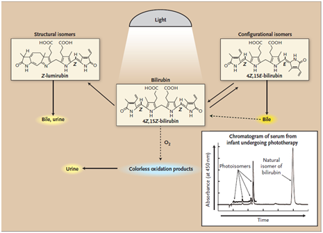 For phototherapy the Green-blue light is effective in the range of 460-490nm. The absorption of light by natural bilirubin causes the formation of isomers of configuration, structural isomers and oxidation products.19 The configurational isomers are faster and more reversible than the structural isomers. Structural isomers are slow and irreversible. Photo oxidation slowly occurs by any of the two structural and configuration isomers, and photo oxidation products are mainly excreted in the urine (Figure 3).20 The absorption of light by the normal form of bilirubin (4Z, 15Z-bilirubin) generates transient excited-state bilirubin molecules. These fleeting intermediates can react with oxygen to produce colorless products of lower molecular weight, or they can undergo rearrangement to become structural isomers (lumirubins) or isomers in which the configuration of at least one of the two Z-configuration double bonds has changed to an E configuration. (Z and E, from the German zusammen (together) and entgegen (opposite), respectively, are prefixes used for designating the stereochemistry around a double bond. The prefixes 4 and 15designate double-bond positions). Only the two principal photo isomers formed in humans are shown. Configurational isomerization is reversible and much faster than structural isomerization, which is irreversible. Both occur much more quickly than photo oxidation. The photo isomers are less lipophilic than the 4Z, 15Z form of bilirubin and can be excreted unchanged in bile without undergoing glucuronidation.19,21 Lumirubin isomers can also be excreted in urine. Photo oxidation products are excreted mainly in urine. Once in bile, configurational isomers revert spontaneously to the natural 4Z, 15Z form of bilirubin. The graph, a high-performance liquid chromatogram of serum from an infant undergoing phototherapy, shows the presence of several photo isomers in addition to the 4Z, 15Z isomer. Photo isomers are also detectable in the blood of healthy adults after sunbathing.19,22
