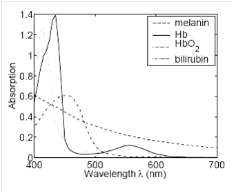 Figure 4 Absorption vs. wavelength graph of hemoglobin, melanin and bilirubin.25