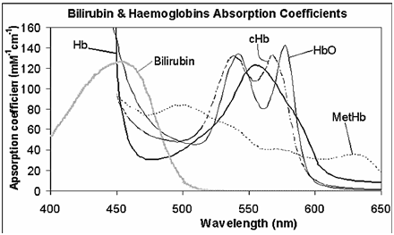 Figure 5 Absorption spectra for Hemoglobin, & Bilirubin in the 400-650nm range.29