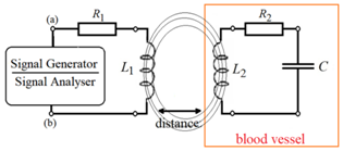 The wireless passive resonant LC sensors studies and developments have had a significant growing in the last two decades because these sensors do not need for power supply, wiring connections and electronics circuits.1,2 These sensors represent great possibilities for monitoring of physiological parameters inside the human body.3 An implantable device has to operate under harsh environment as a blood vessel.2,3 Both development of an implantable intraocular pressure sensor for detection of glaucoma,1 and blood pressure sensor for monitoring blood vessel pressure are application examples.3‒6 The measuring, i.e. pressure in most cases, changes the capacitance of the LC circuit placed within the environment being monitored (Figure 1). Thus the LC resonant frequency is changed as a pressure function. This resonant frequency is detected by a coil, magnetically coupled and outside the sensor environment. A readout circuit is connected to this external coil.6 The coil L1 receives an AC signal from Signal Generator, which induces an electrical current in the coil L2 (Lei de Faraday-Lenz). The energy changes between L2 and the capacitor C induces an electrical current in the coil L1, which will be detected as coupled impedance, measured between (a) and (b) points marked in the Figure 1. The total impedance measured between (a) and (b) points is given by Equation 1.2,7