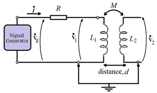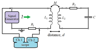 The electrical current, ;is the Ohm’s Law application of the difference of the measured signals read out from Oscilloscope ;on R. The graph of the Mutual inductance vs coils distances is shown in Figure 3. The circuit, for experimental determination of the dependence between impedance (Module and Phase) and resonant frequency, is shown in Figure 4.