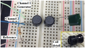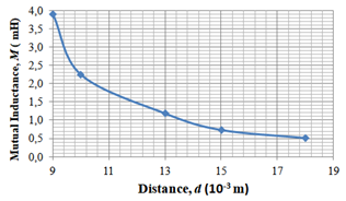 The Mutual inductance was determined by using the circuit showed in Figure 2. The nominal inductances values L1 e L2 are 22mH and the measured ones, by LCR Minipa MX-1010 equipment, were 21,38mH, equals for both coils. The adopted resistor was R = 1kW. The Mutual inductance value is given by:7