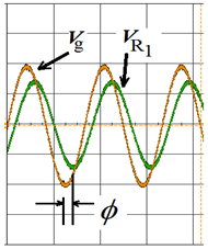 The circuit presented in Figure 4 is the same one presented in Figure 2, but adding R2=47W resistor and capacitor. The adopted capacitor nominal values were 10nF, 33nF and 68nF. The distance in between coils was 10x10-3m. Thus the Mutual inductance will be M » 2,2mH (Figure 3). For each adopted capacitance value, two curves were drawn: the impedance module vs frequency and the impedance phase vs frequency. These graphs were compared with analytical results from Equation 1. A 2V peak-to-peak sinusoidal signal was adjusted on signal generator. The impedance modules values were obtained from Vg/IR1 ratio, where IR1 is the VR1/R1 ratio (Figure 4). Already the impedance phase f (degree) is the phase difference measured between signals Vg and VR1 (Figure 6).