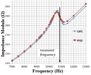 The Figure 7 shows a excellent agreement between analytical and experimental to a 10nF capacitor. This agreement also occurred to 33nF and 68nF ones. Moreover, it was obtained a good qualitatively agreement with literature results.4,6 The resonant frequency values were determined in agreement with literature procedures,6 and showed arrowed on (Figure 7) (Figure 8). The resonant frequency value is given by Equation 3:4