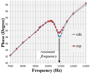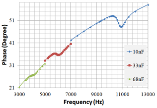 The resonant frequency is the frequency where the phase begin increase again.4,6 The resonant frequencies obtained were around 4kHz from 68nF capacitor, around 6kHz from 33nF and around 11kHz from 10nF.