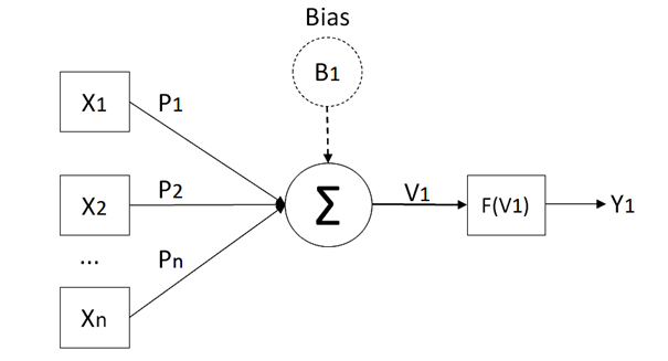 The V1 value is calculated using Eq.1 and then the chosen activation function is applied, resulting in the Y1 output.7