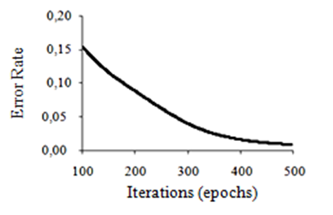 The values shown in Table 1 are represented in the graphs of Figure 3A–3C these values are theoretical and refer to 20 values of an ultrasonic sensor moving over a cube (a), triangle (b) and sphere (c). The network training was performed with 20 neurons in the hidden layer, 0.5 learning rate and 500 iterations. The activation function used in the hidden layer was ReLU and Softmax in the output one. Figure 4 shows the error rate graph during classification by the neural network. The error rate after 500 epochs reached 0.008. After training the network, practical tests using the ultrasonic sensor were performed using the Johnny-Five library and the JavaScript language. Through this library, communication was established between the Arduino and the browser for inputting the normalized data into the neural network. The first object tested was an object in the form of a rectangular block of dimensions 0.8 x 7.0 x 14.0cm. The purpose of this test was to verify whether the network's output values tend to classify this object as a cubic shape. The output values for this test classified the object as cubic, the second classification was spherical. The second object tested was an equilateral triangle with a 15.0cm side. For this test the network classified the object as triangular and in the second classification the probability was that of a spherical object. The third object tested was a 20cm diameter soccer ball. This time the net classified the ball first as spherical and the second probability was the triangular shape.