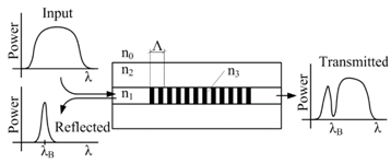 An optical fiber is a transparent cylindrical fiber made from silica glass. Optical fiber consists of an inner core, an outer cladding and acrylate protection with the outer diameter of 250 µm. Optical fibers are used to transmit light between the two ends of the fiber and find wide usage in fiber-optic communications. Specially designed fibers are also used for sensory applications. The most common types of fiber sensors are fiber Bragg gratings. Bragg grating is formed by the periodic change of refractive index in the core of the optical fiber.8 This structure reflects narrow part of propagation light and transmits other wavelengths (Figure 1). Central part of reflected light is called Bragg wavelength and is given by equation: