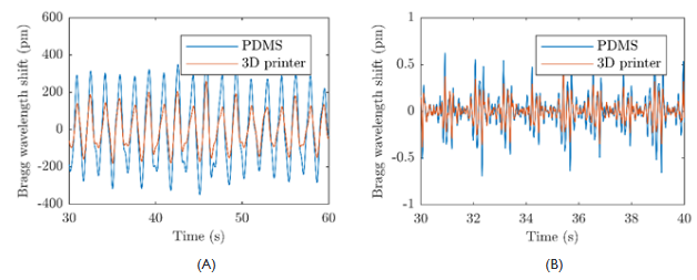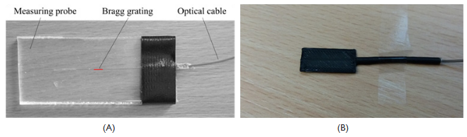 where is effective refractive index of periodic structure in core of optical fiber and ∧ is period between these periodic changes. For biomedical applications, Bragg gratings are encapsulated into polymer polydimethylsiloxane (Figure 2A) and placed on the chest and fixed by a contact elastic strap. Another type of Bragg measurement probe consists of fiber Bragg grating located between two layers in process of print with 3D printer (Figure 2B). The source used for measurement is the wide spectral LED (Light Emitting Diode). Next, there is a circulator that directs light to Bragg grating, and reflected Bragg wavelength directs into OSA (Optical Spectrum Analyzer) where shifts of Bragg wavelengths are analyzed in the spectral domain.