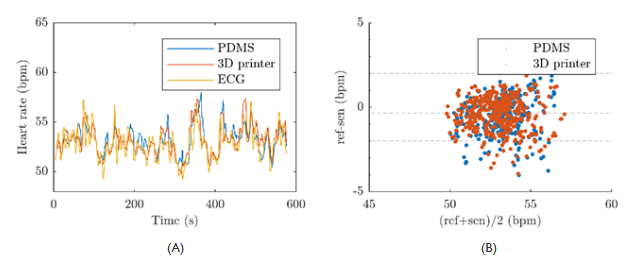Heart rate from both measurement probes based on fiber Bragg grating and reference ECG is shown in Figure 4A & Figure 4B. To compare the differences between the reference signals from ECG and those acquired from both measurement probes, the Bland-Altman plot was utilized.9 The differences between the sensor and the reference traces, x1 – x2, are plotted against the average, (x1 + x2)/2, where x1 is reference heart rate from ECG and x2 is heart rated determine from FBG measurement probes. The reproducibility is considered to be good if 95 % of the results lie within the ± 1.96 SD (Standard Deviation) range.