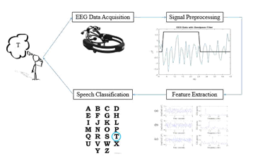 First, the raw EEG data was gathered for an unknown imagined letter using the Emotiv Epoc+. Then the data was preprocessed with a band-pass filter and normalization calculations. This was followed by feature extraction through principal component analysis and Fourier transform. Finally, speech classification was performed using a k nearest neighbors test (k-NN). A visual representation of this process is shown in Figure 1.