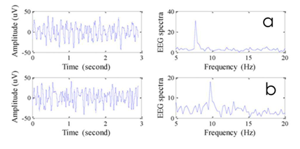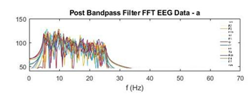 The effect of artifacts and noise were reduced through a multi-step process, with the primary step being the filtering of the EEG signals outside of the range 5-25Hz using a band-pass filter. This filtering process limited the effects of artifacts, since most surface electromyography (sEMG) frequencies (artifacts resulting from facial muscle movements such as blinking) are typically above 25Hz, and the effects of the 60 Hz noise line, as shown in Figure 3. In addition, the data were normalized from -1 to 1 in order to make the peaks more prominent.