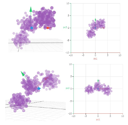 The preprocessed EEG data were then put through a series of feature extraction involving principal component analysis (PCA) and Fast Fourier Transform. PCA uses a linear trans-formation to convert a set of correlated observations into a set of uncorrelated principal components, thereby reducing the dimension of the data set.7 This is done by determining the directions of greatest variance within the data, then rotating the axes to point in these directions. This makes decision boundaries more apparent and therefore makes it easier to classify the data. In this research, PCA was used to convert the preprocessed EEG data into fourteen components, one for each channel. A visual representation of the rotation of axes for PCA is shown in Figure 4. The Fourier Transform of the signal was also used to visually detect which channels would provide the most information. The Fourier Transform described in Equation 2 converts a time-domain signal into the frequency domain where g(t) is the time domain signal, f is the frequency, and t is time. This allowed the data to be analyzed based on which frequencies were present in a signal. An example of using frequency to determine which letter would be best to use is shown in Figure 5. The channel which appeared to have the greatest consistency in frequency peaks were used initially, but eventually all 14 channels were tested.