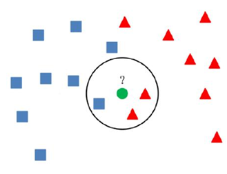 Once the PCA of the preprocessed EEG data was completed, the k-NN algorithm was used for imagined speech classification. The k-NN test is a classification method that uses Euclidean distances between the unknown datum and its known neighbors. The closest neighbor to the unknown datum was used to classify that datum. For example, if the nearest neighbor was classified as the letter a, then the datum was also classified as the letter a. An example of k-NN classification is depicted in Figure 6.