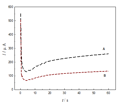 Anodic pretreatment of GC electrode was achieved by oxidation at various anodic potentials for different time periods. Figure 1 depicts I-t curves for anodic oxidation of GC electrode in 0.1M H2SO4 (A) and 0.1M NaOH (B) at constant potential of 2V for 60s. The general features of the two curves are similar. The obtained high current at the beginning of the anodic oxidation (either in acidic or alkaline) was attributed to the charging of the double layer. The curves are similar to that obtained in literature for GC electrode.44 The current decreases to minimum values, before it increases again to reach a certain level. The current reaches its saturation higher limit once the water oxidation process is catalyzed to its possible maximum extent corresponds to the activation of the electrode process towards water oxidation.45 The current obtained under oxidation in the acid is higher than that obtained in the alkali. This may be attributed to the greater surface area (more roughness) obtained in case of acid solution compared to that in the alkaline solution (Figures 2C) (Figure 2F). This is in accordance with literatures.16