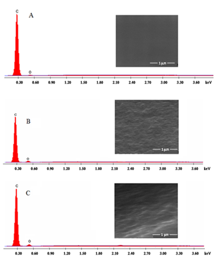 Surface characterization was achieved by taking SEM images and EDX charts for the GC and GCox. The SEM images (Figures 2A) (Figure 2C) demonstrate the morphology and EDX charts of glassy carbon surface before (A, GC) and after oxidation of the GC in the acid (B, GCOX-AC) and in alkali (C, GCOX-AL), respectively at 2V for 300 s. The roughness obtained in case of GCOX-AC is relatively higher than that in case of GCOX-AL. This may be attributed to the higher degree of penetration of the acid than of the alkali. This is in accordance with literatures.16 From the EDX charts, the estimated C/O ratio is 97/3, 90/10 and 92.3/7.7 for GC, GCOX-AC and GCOX-AL, respectively. The increase in the O% upon anodic treatment of the GC is attributed to the increase of surface concentration of the C-O functional groups on the GC surface due to surface oxidation. However, the increase in the C/O ratio upon oxidation in the acid is higher than that obtained in the alkaline solution.