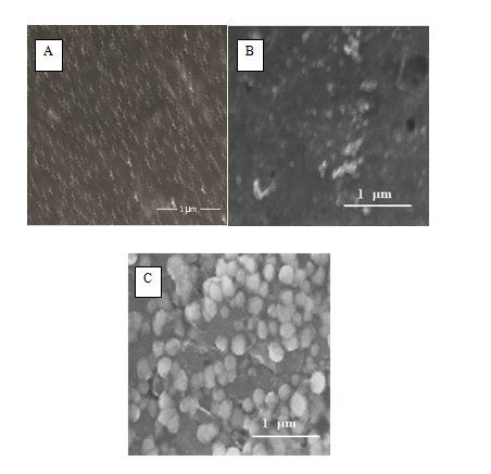 Figure 3 presents SEM images of the GC/NiOx (A), GCox-AC/NiOx (B) and GCOX-AL/NiOx (C). These images show the morphology and particle size distribution of the NiOx on the surface of GC before (A) and after (B, C) activation of the surface in the acid and alkali, respectively. Interestingly, the NiOx nanoparticles electrodeposited on GCOX-AC (B) is bearing a bird-like shape with an average dimension of (60 x 550 nm ± 10 nm). The NiOx particles obtained on GC (A) and GCOX-AL (C) have larger average size of 130 and 80 nm (± 10 nm), respectively and have semi-spherical shape.