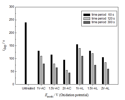 Figure 4 Time required (tdep) for deposition of fixed amount of Ni (Q = 15 mC in all cases) on a pretreated GC by anodic oxidation at different anodic potential, Eanodic in 0.1 M H2SO4 (GCOX-AC: 1V-AC, 1.5V-AC and 2V-AC) and 0.1 M NaOH (GCOX-AL: 1V-AL, 1.5V-AL and 2V-AL) for different time periods (60, 120 and 300 s).