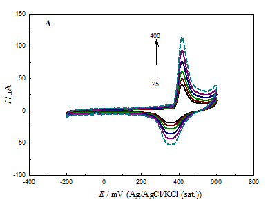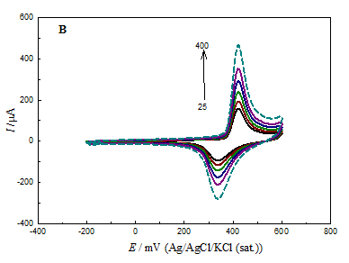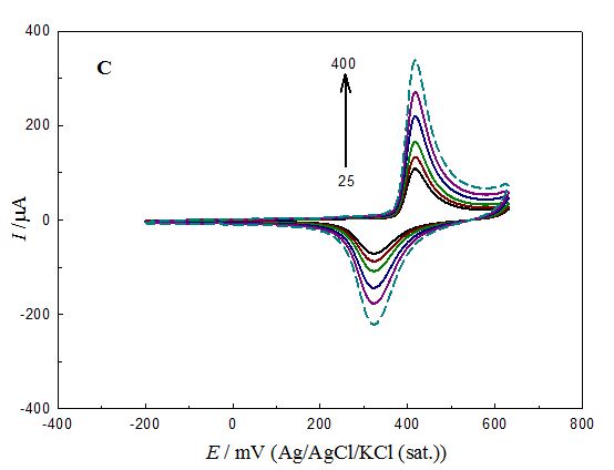 Figure 5 shows characteristics CVs for GC/NiOx (A), GCOX–AC /NiOx (B) and GCOX–AL/NiOx (C) in 0.5M NaOH solution (blank) at different scan rates. For the GCOX-AC and GCOX-AL, the GC was subjected to anodic pretreatment in 0.1M H2SO4 or 0.1M NaOH at 2V for 300 s before nickel deposition. The figure reveals that the peak current for the redox couple (Ni(OH)2 ↔ NiOOH) has the order: GC/NiOx< GCOX–AL/NiOx<GCOX–AC/NiOx for both anodic and cathodic peaks. This increase in the peak current maybe attributed to the modification of the substrate surface structure which gives rise to the enhancement of the NiOx nanoparticles activity. Also, the increase in the surface concentration of C–O functional groups may facilitate the electron transfer for the Ni(OH)2/NiOOH redox couple.