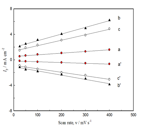 Figure 8 shows LSV responses of GCOX-AC in 0.5M NaOH containing 20mm glucose at scan range from 25 to 400 mVs-1. The LSV reveal an increase of the peak current of glucose oxidation with a notable positive shift in the peak potential with the scan rate. The disappearance of the reversed scan (cathodic scan) and the positive shift is a characteristic of irreversible voltammetric behavior. The peak current obtained for glucose oxidation after subtracting the background (glucose-free LSV) is proportional to the square root of the scan rate (Figure 9), indicating a typical behavior for a mass transfer controlled reaction. The peak current, Ip of diffusion-controlled totally irreversible process can be given by Randles–Sevcik equation (Equation 4):49