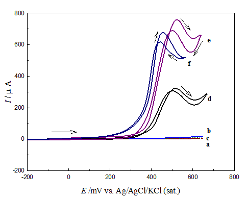 Figure 7 CV responses for glucose oxidation on different electrodes in 0.5 M NaOH containing of 20 mM of glucose solution using scan rate of 100 mV s-1. Electrodes are: GC (a), GCOX-AC (b), GCOX-AL (c), GC/NiOx (d), GCOX-AC/NiOx (e) and GCOX-AL/NiOx (f).