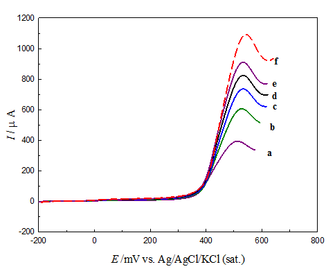 Figure 8 LSV responses for glucose oxidation on GCOX-AC/NiOx from 0.5 M NaOH containing 20 mM glucose. Potential scan rate: (a) 25, (b) 50, (c) 100, (d) 200, (e) 300, (f) 400 mVs-1.