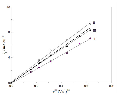 Figure 9 Plots of Ip and ν 0.5for glucose oxidation on GC/NiOx (I), GCOX-AC/NiOx (II) and GCOX-AL/NiOx (III) from 0.5 M NaOH containing 10 mM glucose. Theoretical plot of Randles-Sevick equation is also presented as the dashed line.
