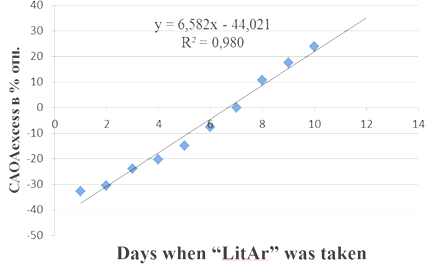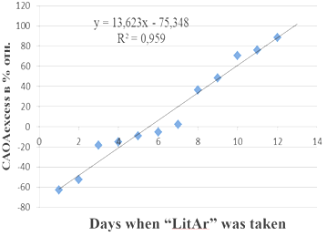 Figure 3 Increase and decrease in the cumulative antioxidant activity (CAOA) of evening urine indicators (CAOAevening) in relation to the control values (CAOAcontr.) of morning urine samples taken according to the Nechiporenko method in relative percentages during the period of taking the “litar” composite.