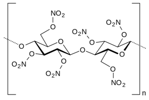 The gunpowders for classical ammunition, whether single-phase, double or triple, as well as a large number of rocket fuels as the basic component of the composition contain nitrocellulose. Nitrocellulose has a similar aspect to cotton, is white and has a fibrous texture. It is produced from cellulose.8 Nitrocellulose (R-ONO2) has good energy and technological properties that enable the production of various types of gunpowders of different ballistic properties, temperature and burning speed, etc. The appearance of the nitrocellulose molecule is shown in Figure 1. The undesirable characteristic of nitrocellulose is chemical degradation with the release of gaseous products. One of simplified mechanisms of nitrocellulose degradation is shown bellow.
