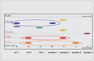 After the sample has been applied on the plate, a solvent or solvent mixture (known as the mobile phase) is drawn up the plate via capillary action. Because different analytes ascend the TLC plate at different rates, separation is achieved.13 The mobile phase has different properties from the stationary phase. For example, with silica gel, a very polar substance, non-polar mobile phases such as heptane are used. The mobile phase may be a mixture, allowing chemists to fine-tune the bulk properties of the mobile phase. After the experiment, the spots are visualized. Often this can be done simply by projecting ultraviolet light onto the sheet; the sheets are treated with a phosphor, and dark spots appear on the sheet where compounds absorb the light impinging on a certain area. The plate is shown in (Figure 2-5) Chemical processes can also be used to visualize spots; anisaldehyde, for example, forms colored adducts with many compounds, and sulfuric acid will char most organic compounds, leaving a dark spot on the sheet. To quantify the results, the distance traveled by the substance being considered is divided by the total distance traveled by the mobile phase. (The mobile phase must not be allowed to reach the end of the stationary phase.) This ratio is called the retardation factor (Rf). If the solvent front is 6 cm then the Rf value for the pigment at 3cm would simply be 0.5 showed in Figure 2,Figure 3.