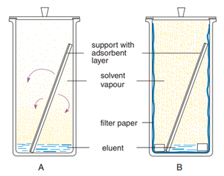 A better control of chromatographic conditions, especially of the vapour phase, is achieved in flat chambers (horizontal chambers) or a trough with sandwich configuration. In these techniques the vapour phase is excluded by a covering plate.