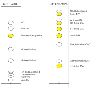 Diphenylamine spot is less intense than nitrodiphenylamine, 4-nitro-diphenylamine and 2-nitro-diphenylamine clearly recognizable. |