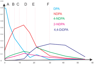 Effective stabilizer is a defined term which is used to assess the stability in the single temperature test. Daughter stabilizers are substances with stabilizing capabilities that were not included in the propellant formulation but were produced from the initial stabilizers during propellant manufacture or ageing. Most stabilizer depletion products fall into this class. Certain stabilizers can appear both as initial stabilizer (incorporated in basic formulation) and as daughter stabilizer (produced from initial stabilizer), this even in the same propellant. Typical examples for such stabilizers are 2NDPA, 4NDPA, pNMA and pNEA – they can be used as initial stabilizers but are also formed from DPA, AKA-II, MC or EC. INITIAL STABILIZERS ("parent stabilizers") are stabilizers that were incorporated in the propellant formulation during manufacture. The content of "effective stabilizer" is calculated from the contents of all initial stabilizers (diphenylamine, 2-nitro-diphenylamine, ethyl centralite, methyl centralite, akardite-II, p-nitro-N-methylaniline, resorcinol-except if they are used as surface moderants) and the content of N-nitrosodiphenylamineas follows. For propellants without diphenylamine as well as for propellants with diphenylamine and other stabilizers.
