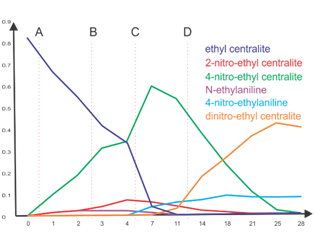 Dintro-centralite recognizable, nitrozo-ethylaniline and 4-nitro-centralite recognizable, the centrality virtually disappeared. |