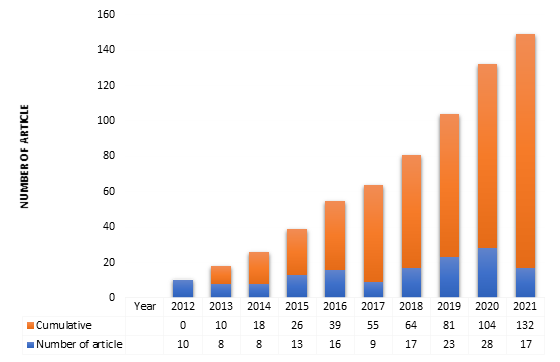 On 23 August 2021, the necessary information was obtained through a Scopus data system. It was achieved by narrowing our search to the subject of E.Coli, sensor, and nanoparticle in the abstract and title on Scopus. These keywords were focused on data mining to analyze the worldwide trend. Although there are 194 publications were found but exclusion was made to a year of publication from 2012 and below. This is because we want to avoid from picking up outdated information. A total 169 publications were gathered and analyzed from 2012 until 2021 by using the query string is as follows: (TITLE-ABS (E.Coli, sensor, and nanoparticle)).