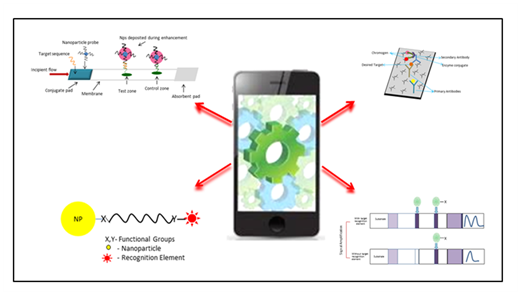Detection of infectious diseases is of prime concern globally. To meet this challenge continuing efforts have been invested to design easy, rapid, sensitive and selective biosensing platforms.1–14 However, efforts mostly remain confined to the diagnostic labs, because such diagnostics require use of expensive devices. Due to which diagnosis of infectious disease becomes costly and unaffordable to majority of population. Therefore, serious efforts are being put to device easy, rapid and cost effective methods affordable to all sectors of population. On the other hand, advances in cell phone technology especially in the area of camera and processor has provided good opportunity for integration with biosensing platform where simple, use and throw, inexpensive, rapid, sensitive, selective and reproducible biosensors could be designed and integrated to the cell phones. Integration of such point of care diagnostics to cell phones will allow accessibility of such systems to majority of population. For the successful design of Biosensor Integrated Point of Care Diagnostic Device (BIPOCD), following features will be desired: (i) Compatibility to maximum cell-phone platforms, (ii) minimum intervention from user, (iii) sensitive and selective enough to provide reliable and reproducible results, and (iv) affordable cost.15 To meet these requirements, seamless integration of biosensors and cell phone is highly desired which is a very complex problem and requires detailed analysis. BICPOCD constitutes of two parts- (i) Biosensing platform and (ii) Cell phone platform (Figure 1). This article will in detail cover challenges in the development of biosensor platform and to some extent cell phone platform.
