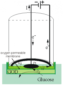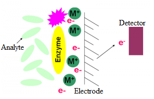 The biosensors are based on the electrons movement, i.e. electronic current determination as a reaction of enzyme-catalyzed redox reaction. Generally a normal contact voltage passes through the electrodes to analyze. In the enzymatic reaction which produces the substrate or product can transfer the electrons with the surface of electrodes to be reduced. As a result an alternate current flow can be measured. The substrate concentration is directly proportional to the magnitude of the current. The reduction of oxygen is acquired through the oxygen electrodes and it is a simple way to from an amperometric biosensor (Figure 2). The example is the determination of glucose by glucose. The above description is about the first generation of amperometric biosensor and it has a direct transfer of electrons which are released from the electrodes are having some difficulties. The second generation amperometric biosensors are developed in a mediator takes the electrons and transfer to the electrodes.