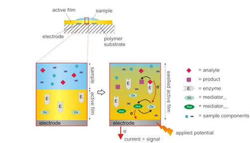 The blood glucose biosensors are used widely throughout the world for diabetic patients. It has a single use disposable electrodes with glucose oxide and derivatives of a mediator (Ferrocence) and the shape of the blood glucose biosensor looks like a watch pen. With the help of hydrophilic mesh electrodes are converted. The blood glucose biosensor is a good example of amperometric biosensor. Swelling of the film and enzymatic reaction are followed by an electrochemical reaction (Figure 3). In these sensor films the active components are immobilized in a matrix consisting of various polymers and other additives.1