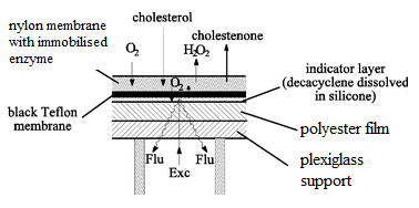 The working of the fiber optic lactate biosensor is based on the measurement of change in oxygen concentration, molecular by identifying the effects of oxygen in fluorescent dye. The following reaction is reduced by the enzyme lactate mono-oxygenase. The oxygen depends on the amount of fluorescence generated by the dyed film this is because of oxygen has a reducing effect on the fluorescence. In the reaction mixture the concentration of lactate is increased, oxygen is utilized and as a result, there is a proportional decrease in the quenching effect. Hence there is an increase in the fluorescence output can be measured (Figure 4).
