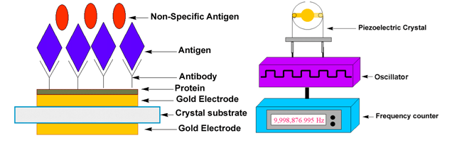 The principle of piezoelectric biosensor is used in sound vibrations, hence it is called acoustic biosensors. The basics of the biosensors are formed by the piezoelectric crystals and the characteristic frequencies are trembling with the crystals of positive and negative charge. By using the electronic devices we can measure the certain molecules on the crystal surface and alters the response frequencies using these crystals we can attach the inhibitors. The biosensors for cocaine in the gas phase has been developed by attaching the antibodies cocaine to the surface of the crystal (Figure 5).
