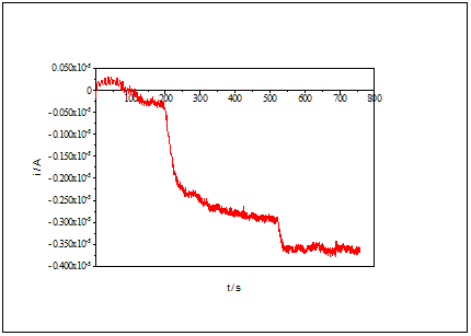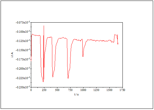 Graphics from experiment, which we made, are similar. We decided to show the most characteristic of them, which are most interesting in student discussion. In chronoamperometric method, in experiment with banana like biosenzor, dopamin + buffer added to the beaker to induce a leap, or amperometric response to the receptor, and obtain the following Figure 7.