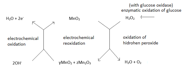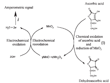 The biosensor is used to detect the analyte so the biosensor is an analytical device and it gathers the biological components with a physicochemical detector. The sensing biological elements are biometric components interact with the recognize and analyze the study and the components like tissue, microorganisms, antibodies, nucleic acids and etc. The sensitive elements of biological can also generate by the biological engineering. The detector elements transform the signals from the interface of analyte with the biochemical elements into other signals like transducer and it can be measured more easily and qualified. The biosensor devices are associated with the electronics and the signal processors and they are generally responsible for the display of the results and they are user-friendly. The biosensor research has a significant role in the development of modern electronics.1,10,11The method is based on the application of the trowel system (Table 1): Ag / AgCl like reference electrode; Pt electrode like counterelectrode (it closes the electron circuit) and working electrode like tile sensor, which can be of different composition. The key element is that students build a working electrode. One of recepture was showed in Method-part. For the detection of H2O2 we used biosensor as for glucose, as shown by the following reaction on Figure 9, and the biosensor based on the incorporation of glucose oxidase as a biocomponent and MnO2 as a carbonate paste modifier (on carbon print or carbon paste electrode). The second experiment has the same essence of the test, and the ultimate result is that students gain the impression of creating a new biosensor. When working on HPLC, it took a lot of time to look for optimal parameters from which the clarity of the final graphics depends. The reactions relevant to the second experiment are simplified in Figure 10. The electrochemical oxidation of L-ascorbic acid (H2A) at various electrode surfaces has been a subject of great interest because of the significance of this compound in biological-biochemical (e.g., neurochemistry) and electrochemical (e.g., electrocatalysis) settings.12 The reaction mechanism of ascorbic acid at an MnO2 modified sensor based on heterogeneous carbon material is shown in Figure 10 which demonstrates12 chemical and electrochemical reactions occurring in the recognition layer of the sensor.